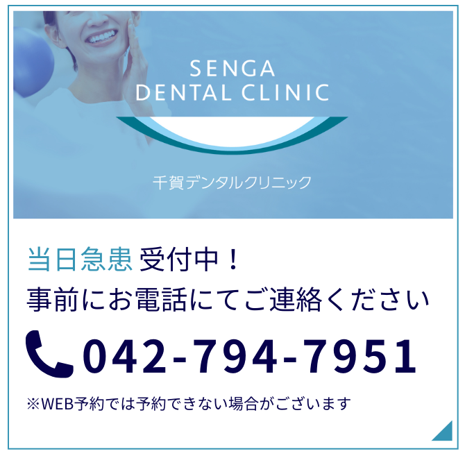 町田東急ツインズ(ウエスト)7階にある歯医者。急な歯のトラブルに迅速に対応するため、事前予約なしでもご来院いただけます。